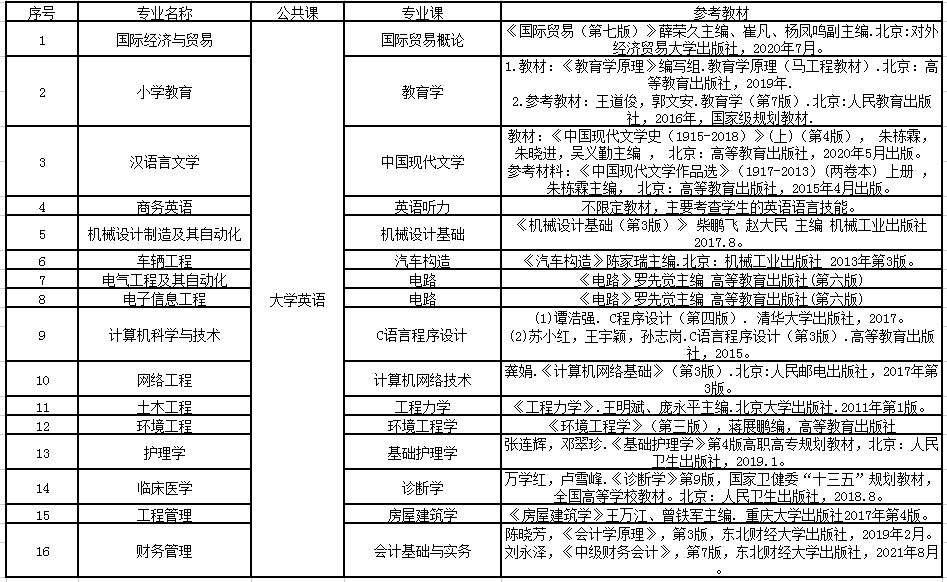 1.普通考生及专项计划考生考试科目为2门:一门公共课和一门专业课。《大学英语》总分100分,考试时长120分钟;专业课总分150分,考试时长120分钟,具体要求见官网发布的课程考试大纲(见附件4)。