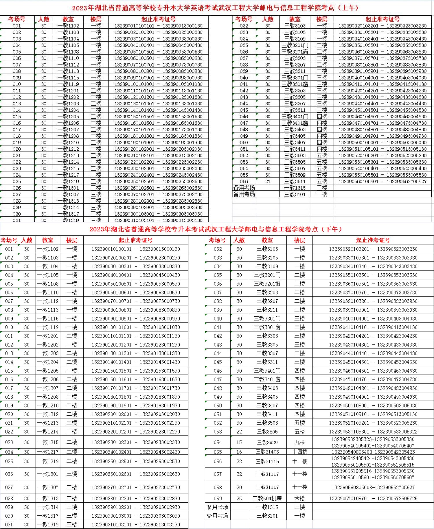 2023年武汉工程大学邮电与信息工程学院专升本考场安排